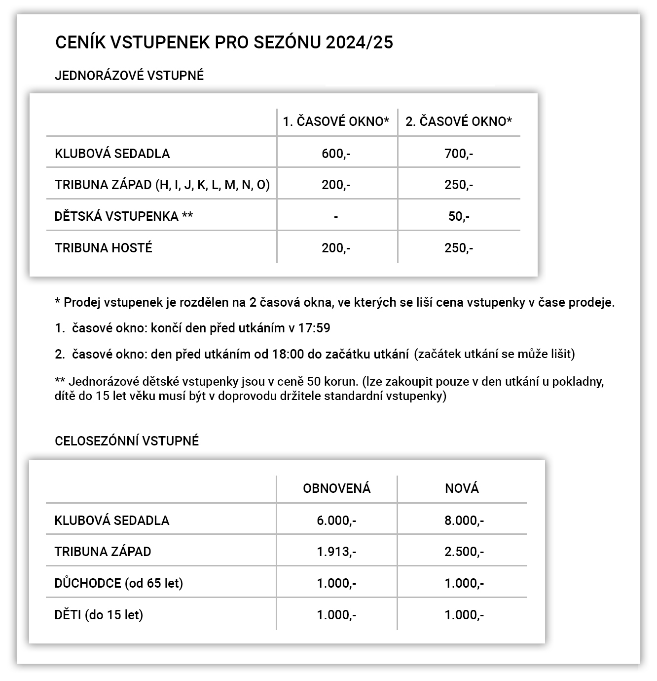 Jednorázové vstupenky lze pořídit opět ve dvou cenových hladinách – v předprodeji do 24 hodin před výkopem za 200 korun, posléze za 250 korun. Pro letošní sezónu zůstávají v prodeji také jednorázové dětské vstupenky v ceně 50 korun, ty lze zakoupit pouze v den utkání u pokladny, dítě do 15 let věku musí být v doprovodu držitele standardní vstupenky.
