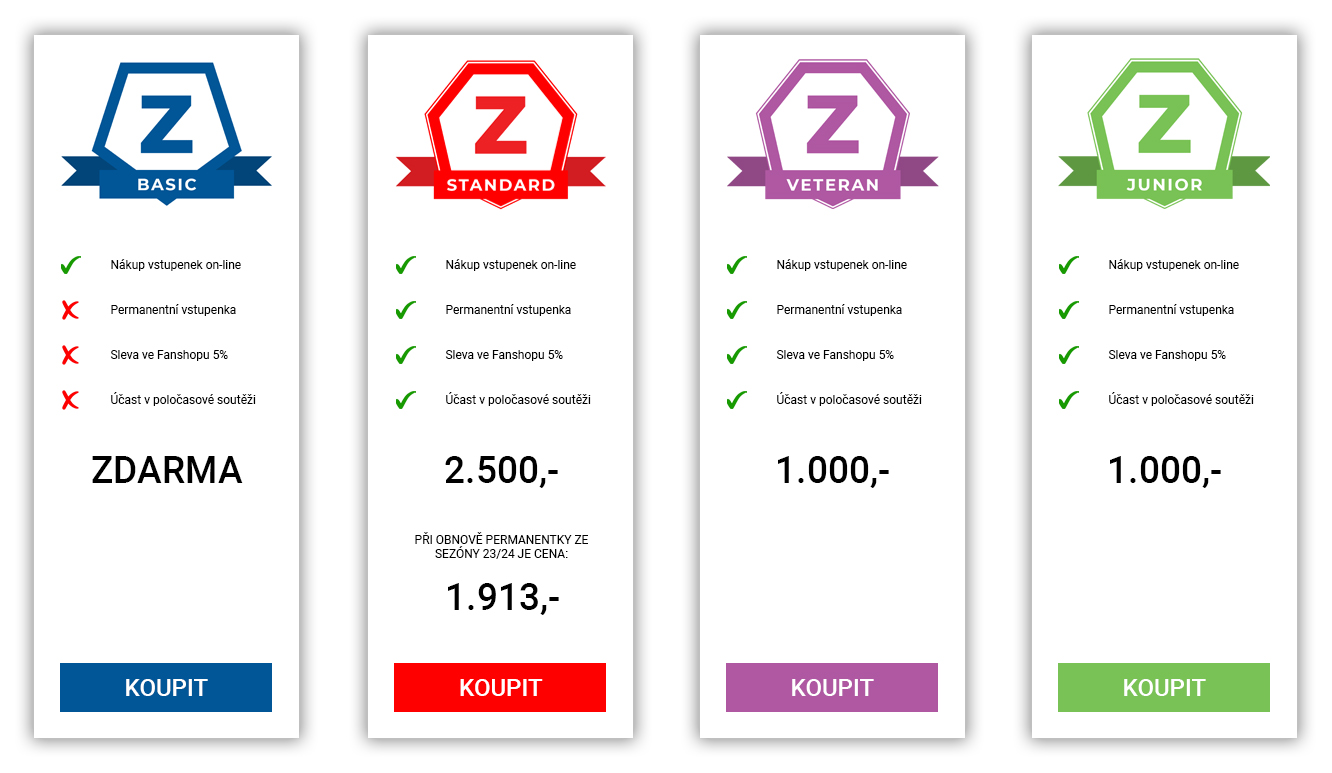 Ceny se nemění, začínají tak na 1000 korunách v programech Veterán a Junior. Obnovená permice vás přijde na 1913 korun a nová na 2500 korun. Jeden zápas tak v kategoriích Veterán a Junior stojí 66 korun, u obnovené standardní permice 127 korun a u nové 166 korun.