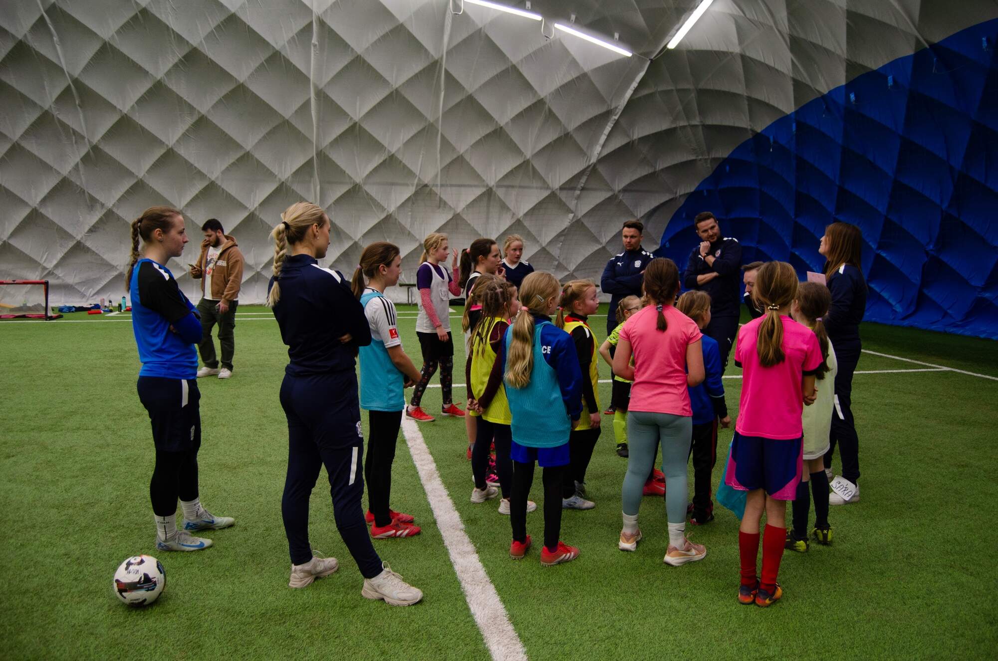 Na několika stanovištích se hráčky po skupinách střídají. Hrají fotbal, vyzkouší si brankářské dovednosti i otestují kondiční schopnosti. „U každého stanoviště je vždy trenér nebo trenérka, kteří jsou v tomto oboru silní. Takže na stanovišti s brankářskými dovednostmi je naše trenérka brankářek a podobně,“ vysvětlila Houšťová.